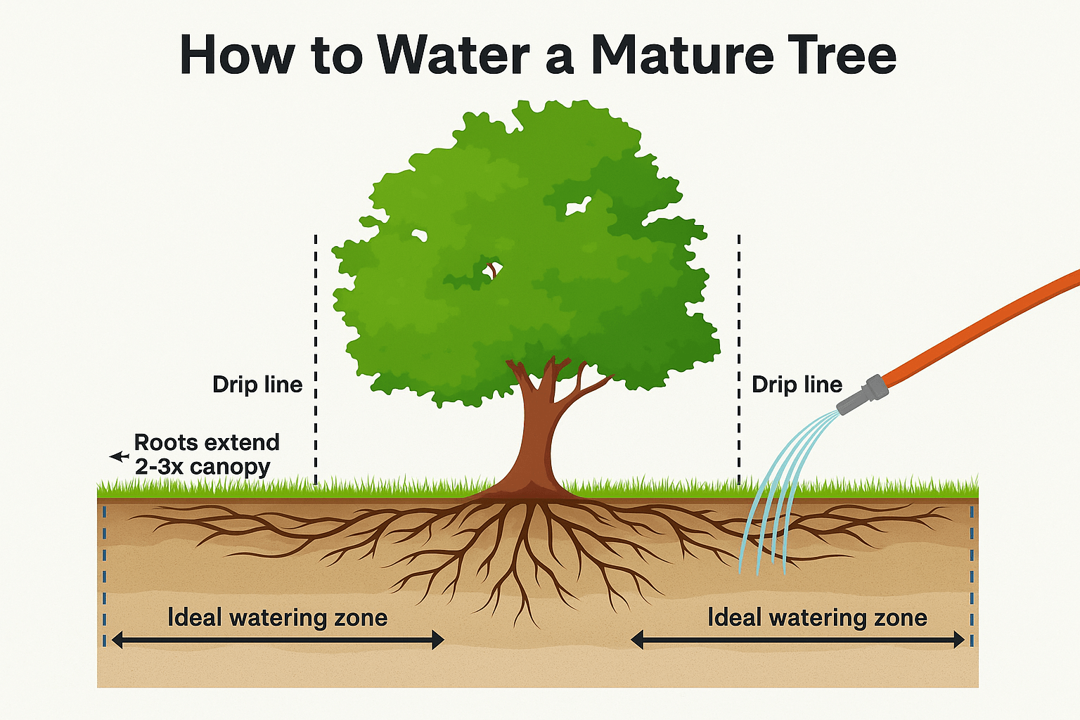 - Mature trees often have roots extending 2–3 times beyond the canopy, so water wide, not just close to the trunk. Do not use a watering bag as there are no absorption roots at the base of the tree.