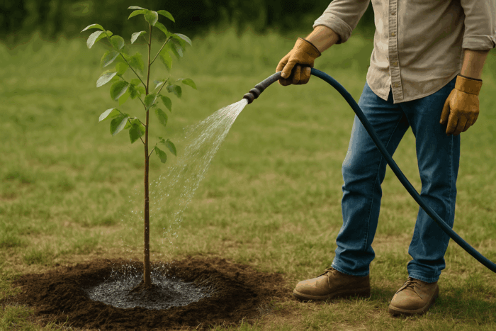 - Focus watering at the root ball and near the drip line (the edge of the canopy), where roots are actively growing.